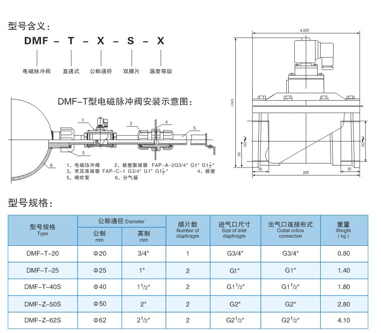 DMF-T型電磁脈沖閥為直通閥,其進(jìn)氣口之間夾角為180°,(進(jìn)出口中心線為同一直線),其進(jìn)口與儲氣筒連接,出口與噴吹管連接。氣流暢通,能提供符合要求的清灰氣脈沖。