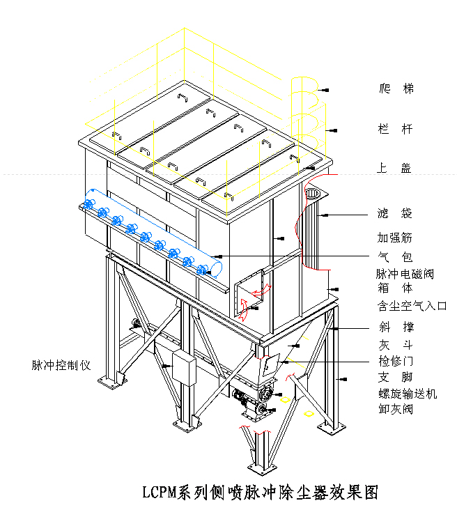 含塵氣體由進風(fēng)口進入進風(fēng)管內(nèi)經(jīng)過初級沉降后,較粗的顆粒及大部份粉塵在初級沉降及自身重力的作用下,沉降至灰斗中,并經(jīng)螺旋輸送機機構(gòu)將粉塵從出灰口排 出。另一部分較細粉塵在引風(fēng)機的作用下,進入中箱體并吸附在濾袋表面上,潔凈空氣穿過濾袋進入上箱體并流經(jīng)矩形誘導(dǎo)文氏管匯集在出風(fēng)箱內(nèi)從出風(fēng)管口排出。 為了保證系統(tǒng)的系統(tǒng)的正常運行,除塵器阻力應(yīng)維持在限定值(1200Pa)的范圍內(nèi),故必須采用清灰來達到抖落粉塵,降低設(shè)備阻力的目的。該系列除塵器是采用脈沖控制儀定時控制低壓脈沖閥進行噴吹清灰的方法,使濾袋在其噴吹及誘導(dǎo)氣量的作用下,造成布袋瞬間鼓脹抖落粉塵。
