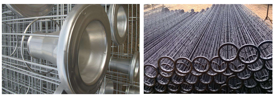 除塵器骨架也稱除塵袋籠,是濾袋的“肋骨”,采用專用設(shè)備一次焊接成型,材質(zhì)為鐵絲或不銹鋼絲,表面后處理采用鍍鋅、噴塑、有機硅等方式。
